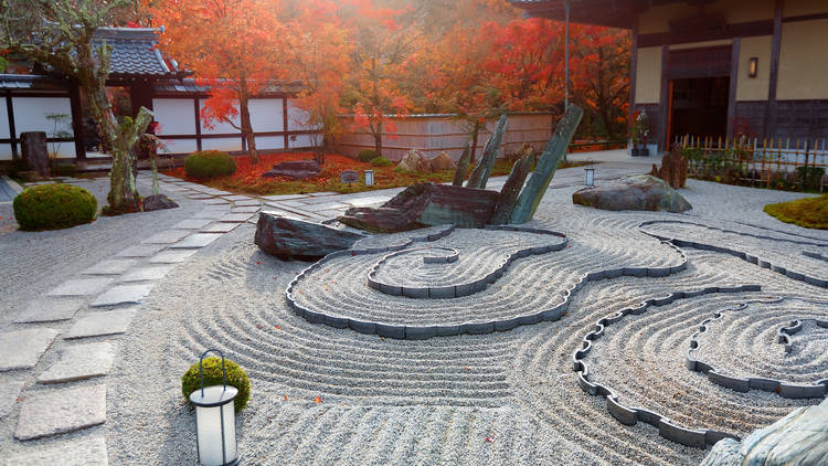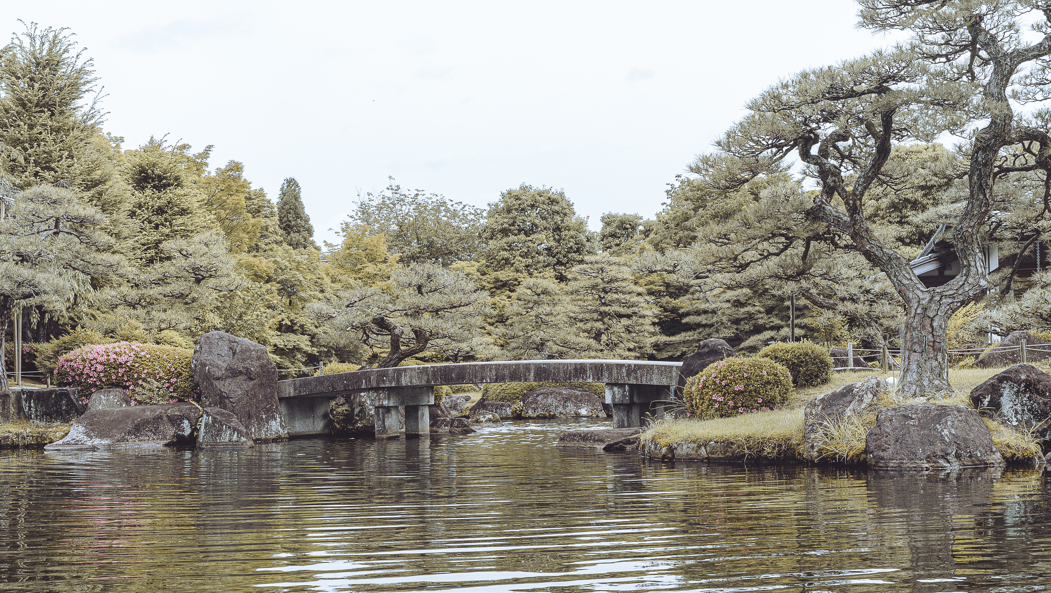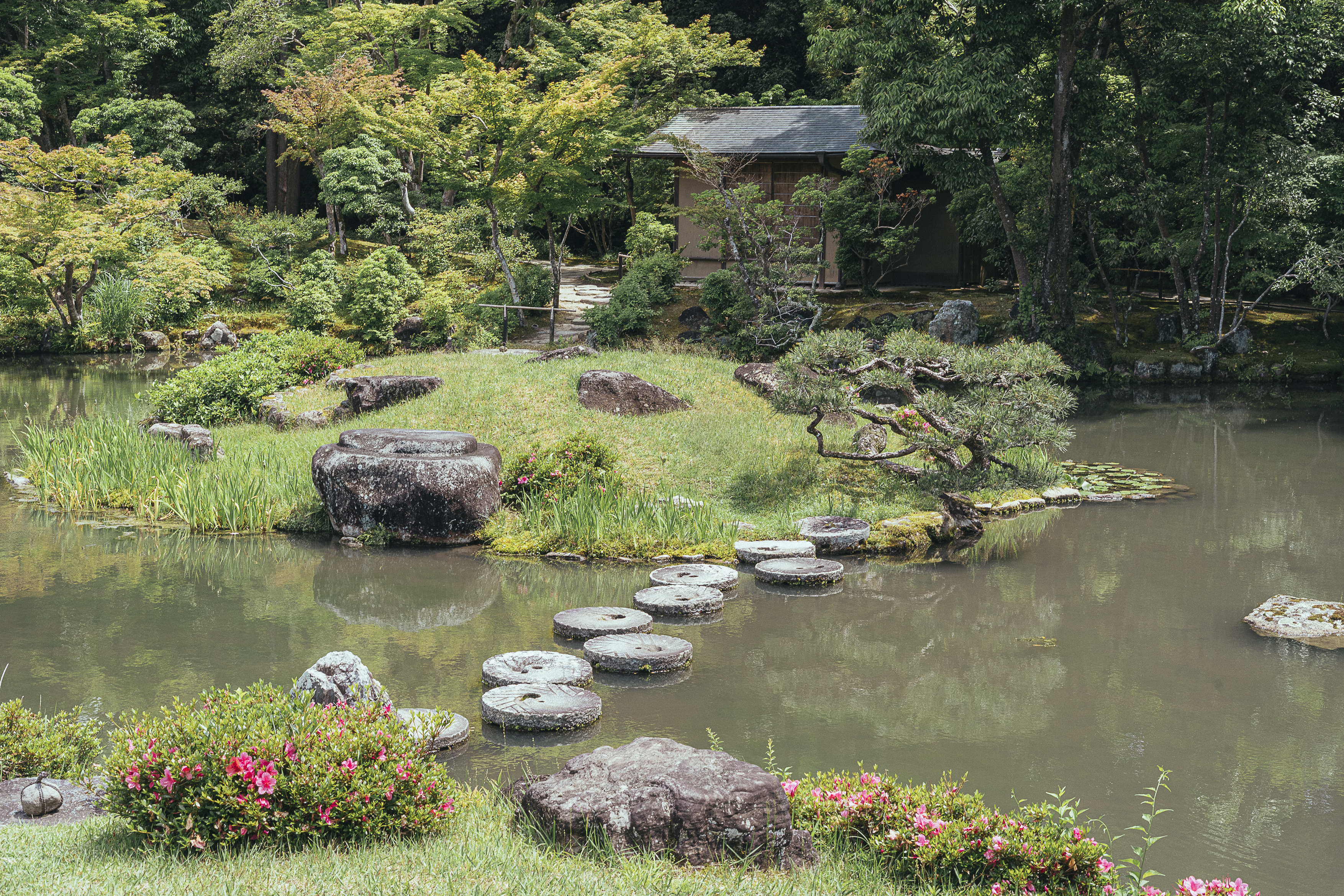 A Japanese Garden in Kyoto, Japan. A large pond in the foreground with some circular stepping stones. Pine trees and azaleas in the distance with the roof of a temple visible behind the trees. Japanese Garden, Kyoto
